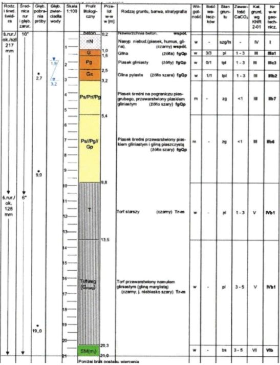 Poniżej zamieszczono przykładowy profili geotechniczny ustalony w trakcie badań geotechnicznych. Zalegające w podłożu warstwy odkształcalnych torfów różnej grubości przykryte są z reguły cienką warstwą zagęszczonych piasków. Grubość górnej warstwy piasków umożliwiła posadowienie bezpośrednie garażu podziemnego, jednak była niewystarczająca do przeniesienia obciążeń w obszarze wielokondygnacyjnych budynków mieszkalnych. W tym obszarze zdecydowano o wykorzystaniu pali. Ze względu na bardzo trudne warunki realizacji robót palowych (m.in. ryzyko uszkodzenia pali wierconych w trakcie formowania trzonu w gruncie) wybrano żelbetowe pale prefabrykowane.